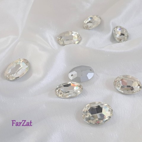 Cristal forma ovala, dimensiune 20 x 30 mm, are multiple fete plane si dispune de doua gauri laterale pentru prindere.