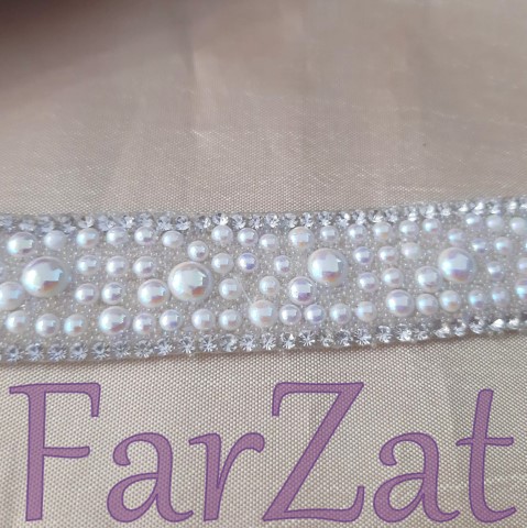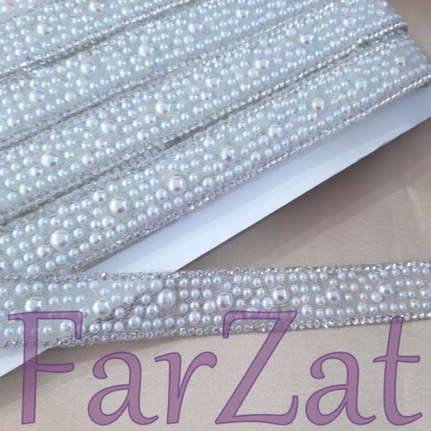 Aplicatie termoadeziva cu strasuri (2 mm alb cristal) si jumatati perla (3 mm, 4 mm, 6 mm alb AB).