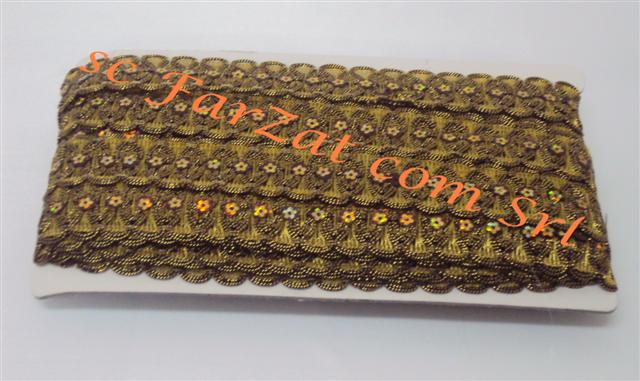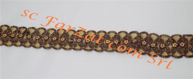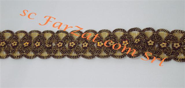 Aplicatie textila lata de 3 cm, este o broderie foarte eleganta formata din ata maro cu fir auriu iar peste ea sunt aplicate paiete maro si aurii cu reflexe de aurora boreala .