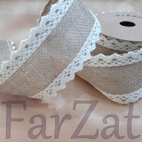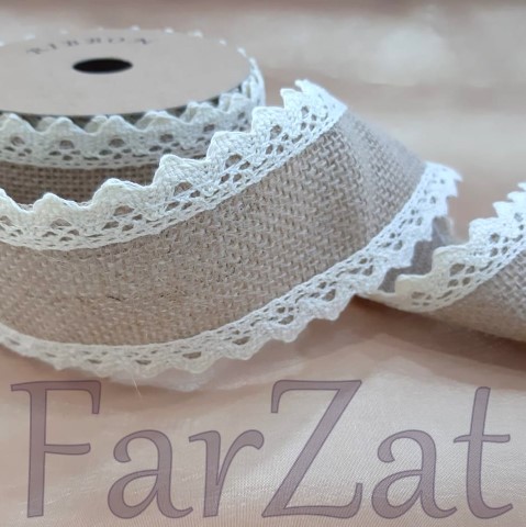 Panglica din iuta este accesorizata cu dantela crem, ideala pentru diverse decoratiuni.