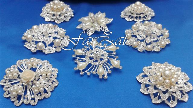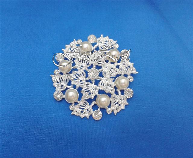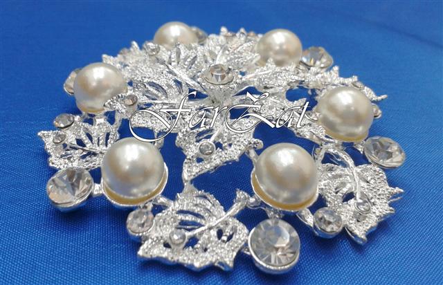 Brosa are un design deosebit, este realizata din metal argintiu cu perle de culoare alb sidefat si are aplicate pietricele stralucitoare din acril.