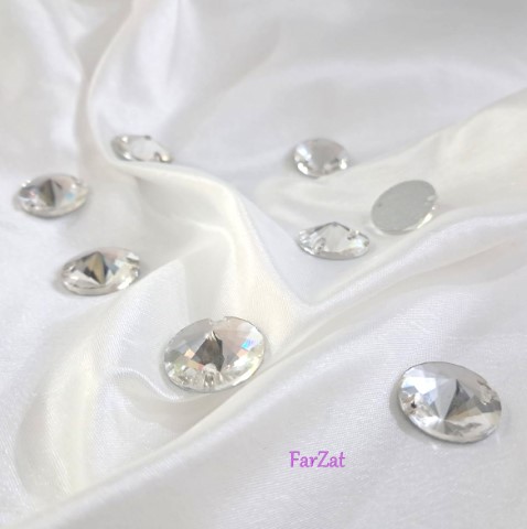 Cristale de aplicat pe diferite articole vestimentare, au forma conica cu multiple fate plane, dispun de doua gauri pentru prindere iar spatele este plat, de culoare gri.