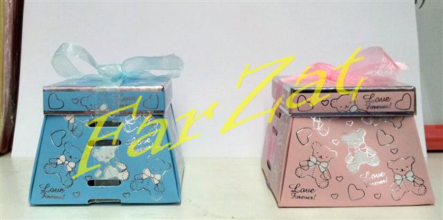 Cutiuta pentru marturii are forma cubica cu latimea de 6 cm, si este legata cu o fundita din organza lucioasa.