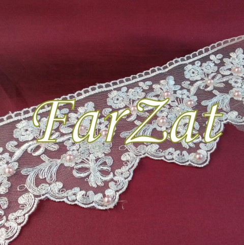 Pe banda din dantela de culoare roz pal sunt atasate mici perlute roz prafuit si strasuri de culoare alb cristal.