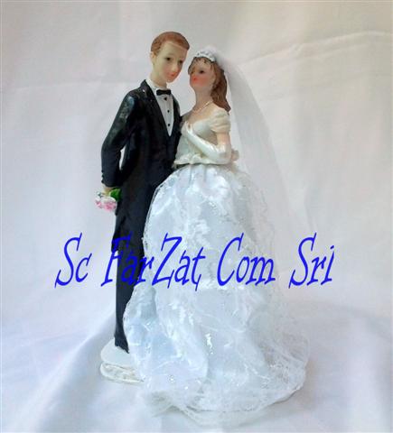 Figurina de tort tip mire si mireasa. Mireasa este imbracata cu o rochie din saten acoperita cu dantela si lame, are un design deosebit si masoara 23 cm inaltime.