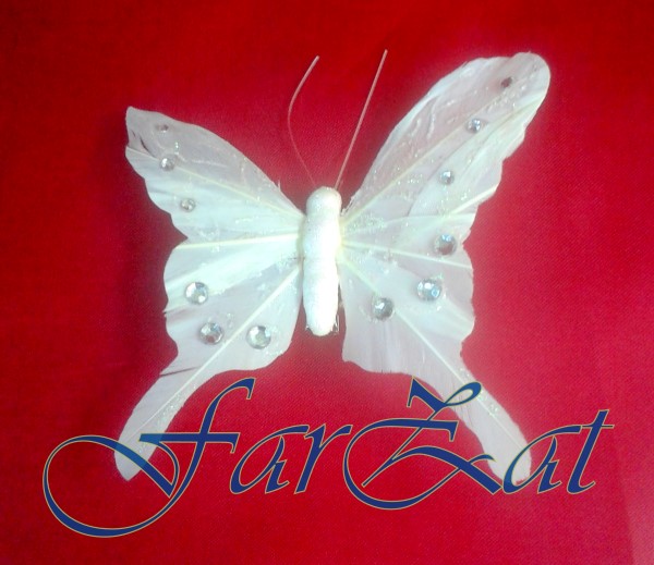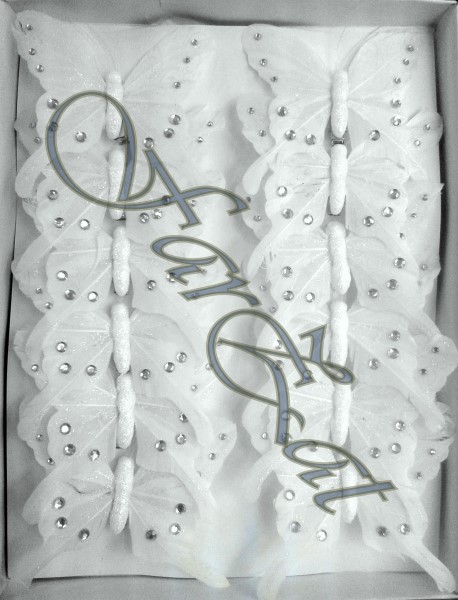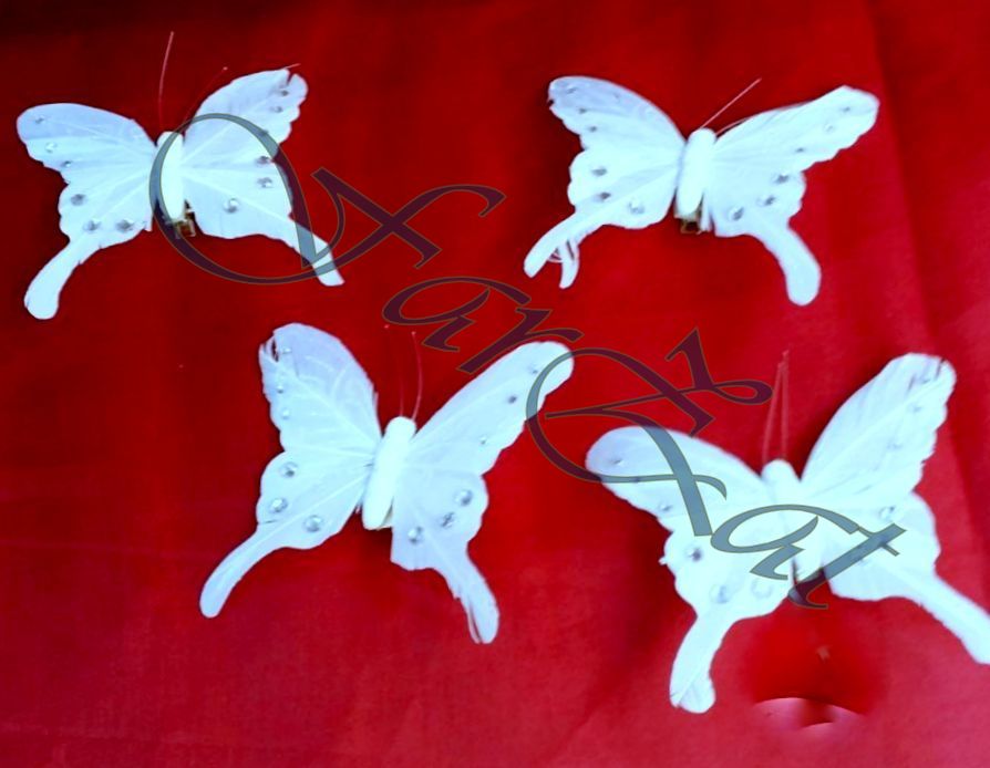 Fluturii decorativi sunt confectionati din pene naturale albe cu strasuri si sclipici.