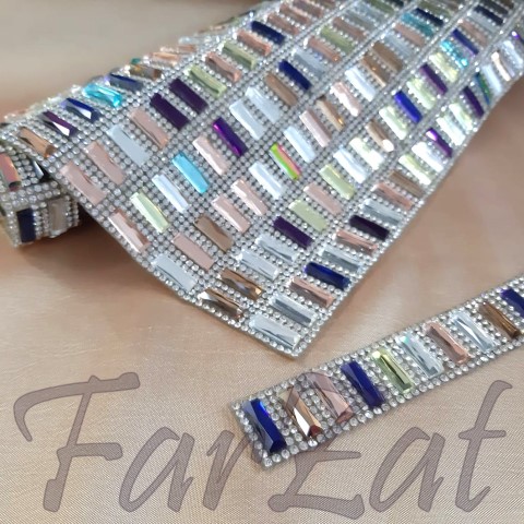 Folie hotfix realizata din strasuri alb cristal (2 mm) si cristale dreptunghiulare colorate (5 x 15 mm).