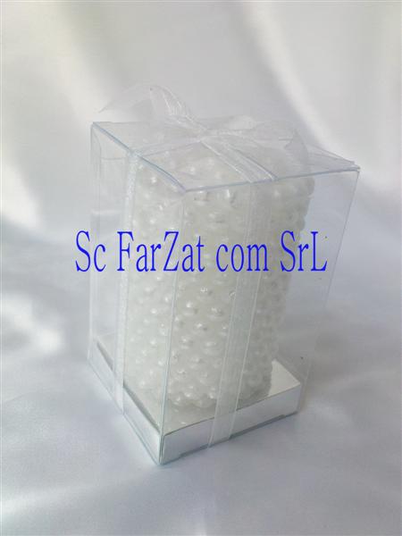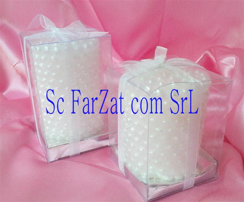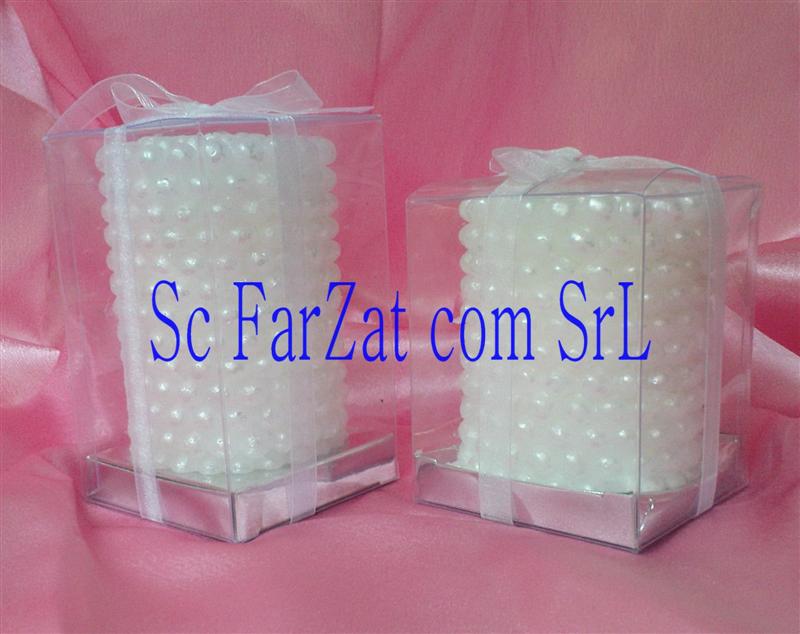 Lumanare decorativa ce are sculptat pe suprafata gen perle albe. Este ambalata in cutie individuala transparenta ,legata cu o fundita din organza alba. Lungimea lumanarii este de 8 cm,latimea de 6 cm, greutatea este de cca 220gr .Este un accesoriu deosebit ce descrie cel mai important moment al evenimentului.