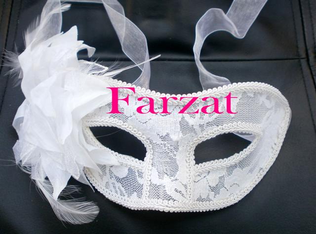 Masca dantela cu  floare din organza si  pene.  Acest tip de masca are panglica pentru prindere, este de marime universala si  poate fi purtata la diverse ocazii festive, baluri mascate, Halloween, aniversari, atat de adulti cat si de copii.