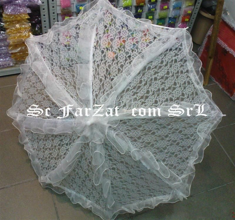 Umbrela din dantela pentru mirese cod 19. reprezinta un accesoriu special pentru o mireasa de o eleganta clasica ce te duce cu gandul la toalete vaporoase de voal si matase, la cochetarie si parfumuri , sunt utile pentru sedinta foto dar si practice pentru o nunta in sezonul estival. dispunem de o varietate larga de modele simple sau captusite la preturi foarte accesibile