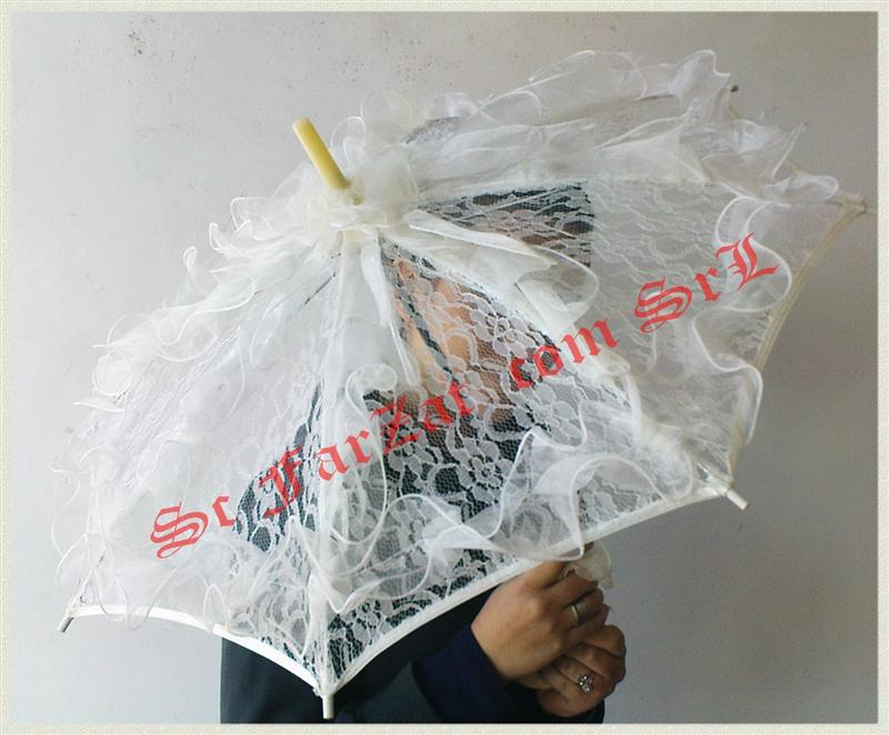 Umbrela mica din dantela cu volanase,pentru mirese.Reprezinta un accesoriu special pentru o mireasa de o eleganta clasica ce te duce cu gandul la toalete vaporoase de voal si matase, la cochetarie si parfumuri.Sunt utile pentru sedinta foto,dar si practice pentru o nunta in sezonul estival.